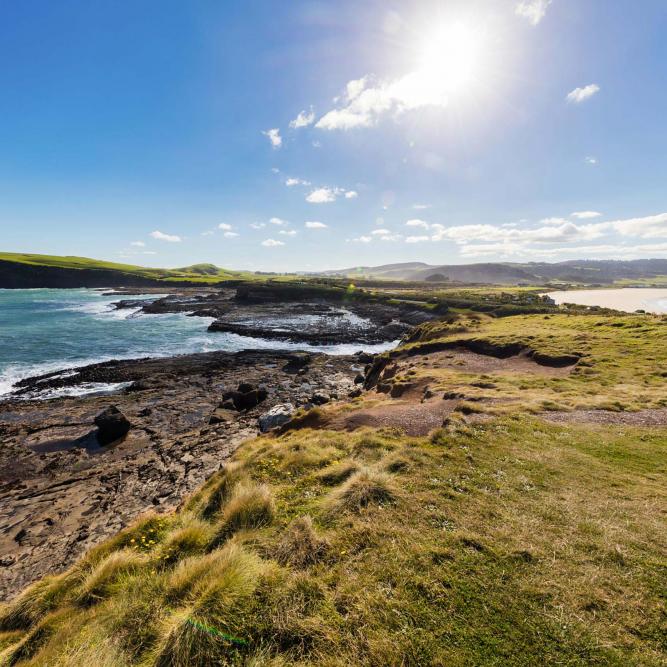 Willkommen beim Slope Point: Über grüne Schafweiden, vorbei an windschiefen Bäumen und steilen Kliffs gelangt man zum südlichsten Punkt der Südinsel. Nur noch 4803 Kilometer ist man hier vom Südpol getrennt.